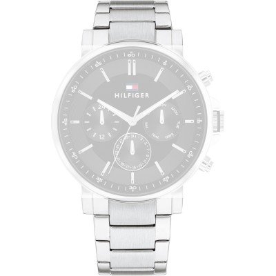 This Tommy Hilfiger watch strap is made of stainless steel and is attached to the watch by means of steel pins. The band has a width of 22 mm and is closed by means of a deployment clasp with push buttons. The strap has no straight mount which means that this strap is only suitable for the watches listed below.