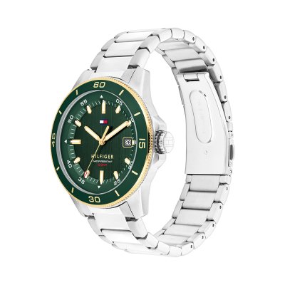 This Tommy Hilfiger watch has a case made of stainless steel with a diameter of 43 mm and is fitted with a stainless steel band. Inside the case lies a Seiko Instruments Inc. movement and the watch features a Mineral crystal.