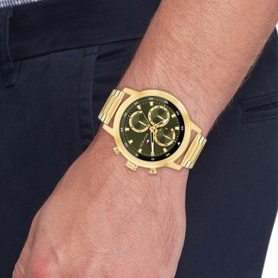This Tommy Hilfiger watch has a case made of stainless steel with a diameter of 46 mm and is fitted with a stainless steel band. Inside the case lies a Seiko Instruments Inc. movement and the watch features a Mineral crystal.