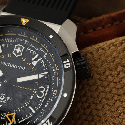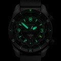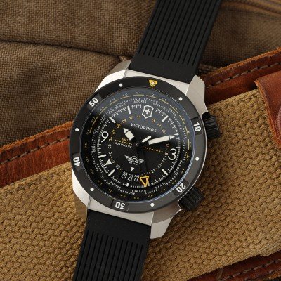 This Victorinox watch has a case made of stainless steel with a diameter of 43 mm and is fitted with a rubber band. Inside the case lies a Sellita movement and the watch features a Single anti-reflective sapphire crystal.