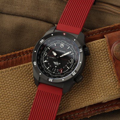 This Victorinox watch has a case made of stainless steel with a diameter of 43 mm and is fitted with a rubber band. Inside the case lies a Sellita movement and the watch features a Single anti-reflective sapphire crystal.
