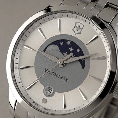 This Victorinox watch has a case made of stainless steel with a diameter of 35 mm and is fitted with a stainless steel band. Inside the case lies a Ronda movement and the watch features a Sapphire crystal.