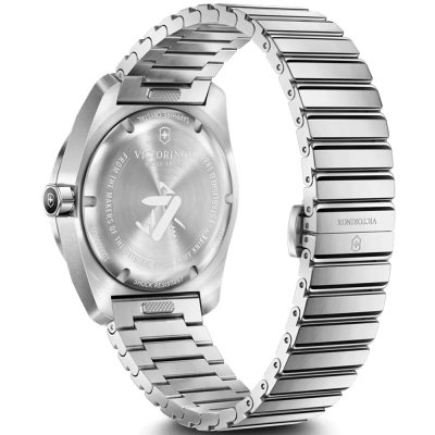 This Victorinox watch has a case made of stainless steel with a diameter of 39 mm and is fitted with a stainless steel band. Inside the case lies a Ronda movement and the watch features a Single anti-reflective sapphire crystal.