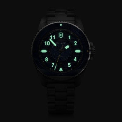 This Victorinox watch has a case made of stainless steel with a diameter of 43 mm and is fitted with a stainless steel band. Inside the case lies a Sellita movement and the watch features a Sapphire crystal.
