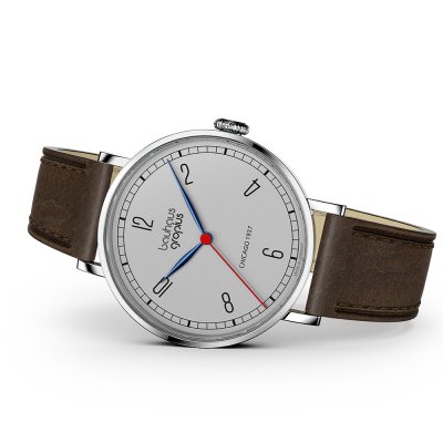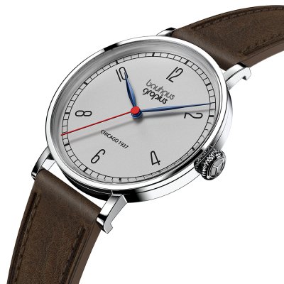This Walter Gropius watch has a case made of stainless steel with a diameter of 38 mm and is fitted with a leather band. Inside the case lies a Miyota movement and the watch features a Double anti-reflective sapphire crystal.