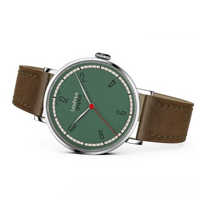 This Walter Gropius watch has a case made of stainless steel with a diameter of 38 mm and is fitted with a leather band. Inside the case lies a Miyota movement and the watch features a Double anti-reflective sapphire crystal.