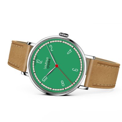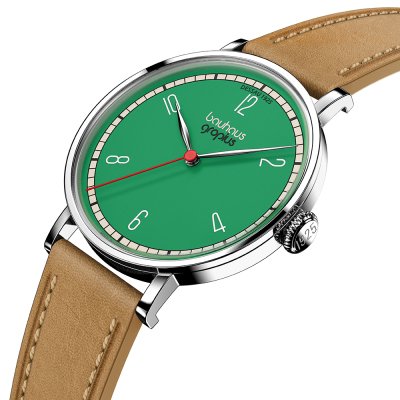 This Walter Gropius watch has a case made of stainless steel with a diameter of 38 mm and is fitted with a leather band. Inside the case lies a Miyota movement and the watch features a Double anti-reflective sapphire crystal.