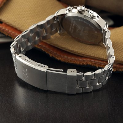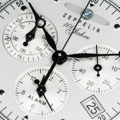 This Zeppelin watch has a case made of stainless steel with a diameter of 42 mm and is fitted with a stainless steel band. Inside the case lies a Ronda movement and the watch features a K1 Mineral crystal.