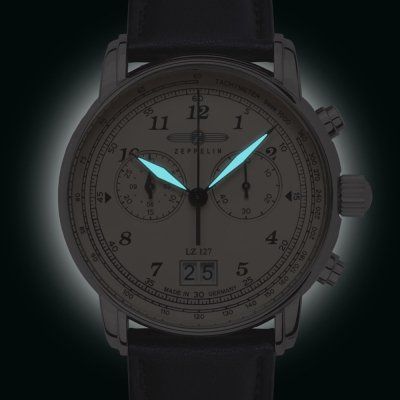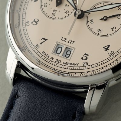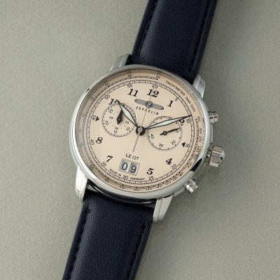 This Zeppelin watch has a case made of stainless steel with a diameter of 40 mm and is fitted with a Vegan leather band. Inside the case lies a Ronda movement and the watch features a K1 Mineral crystal.