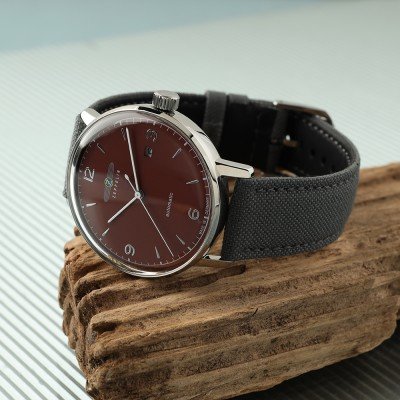 This Zeppelin watch has a case made of stainless steel with a diameter of 40 mm and is fitted with a textile band. Inside the case lies a Miyota movement and the watch features a K1 Mineral crystal.