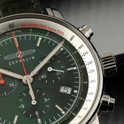 This Zeppelin watch has a case made of stainless steel with a diameter of 42 mm and is fitted with a leather band. Inside the case lies a Ronda movement and the watch features a K1 Mineral crystal.