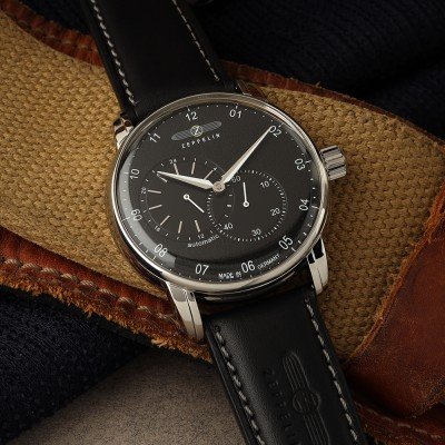 This Zeppelin watch has a case made of stainless steel with a diameter of 42 mm and is fitted with a leather band. Inside the case lies a Miyota movement and the watch features a K1 Mineral crystal.